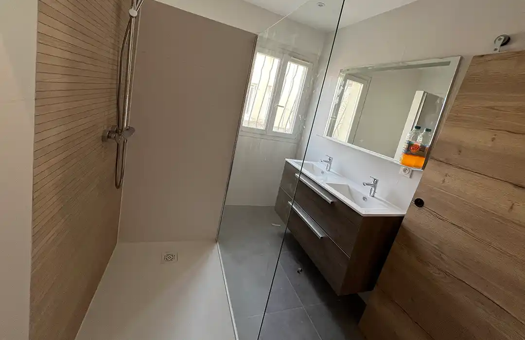 Nous avons pris en charge l’ensemble des interventions nécessaires : isolation sous rampants, habillage en plaques de plâtre et finitions, mise en peinture complète, création d’un sol stratifié effet bois, intégration de spots encastrés, reprise des réseaux électriques, création d’une salle d’eau contemporaine, pose d’un receveur extra-plat et paroi vitrée, installation d’un meuble double vasque suspendu et pose de faïence murale grand format.